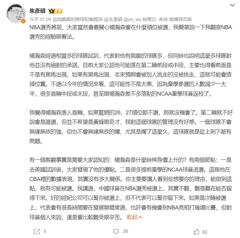 朱彥碩表示:楊瀚森試訓多支球隊說明很多球隊對他有意思,側面也說明楊瀚森沒有得到某一支球隊的選中承諾。今年棄選的人很多,尤其是首輪中/末段的都回NCAA再打拼一年,楊瀚森是有希望進入首輪的。
