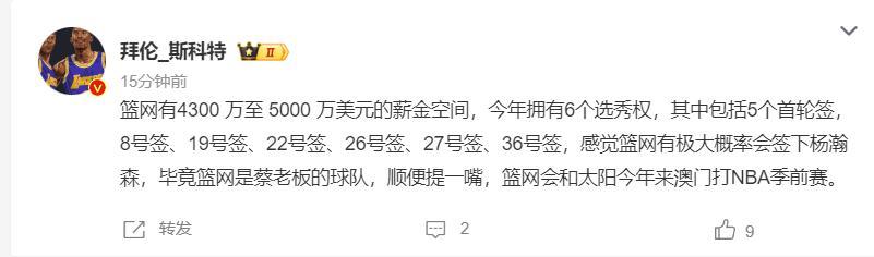 在籃網、綠凱、老鷹大交易後籃網手握5個首輪籤與一個次輪籤,次輪籤是36號,而且籃網是蔡老闆的球隊,感覺籃網極大概率會選中楊瀚森。