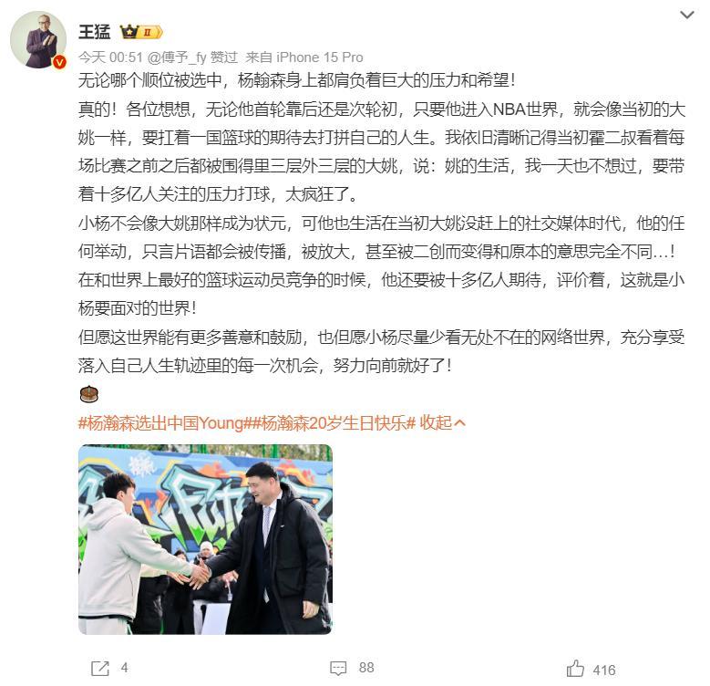 王猛表示:無論哪個順位選中,楊瀚森身上都肩負重大壓力和希望。就像當年的姚明一樣,他要扛着一國的籃球期待打拼下去,希望大家多給鼓勵和善意。