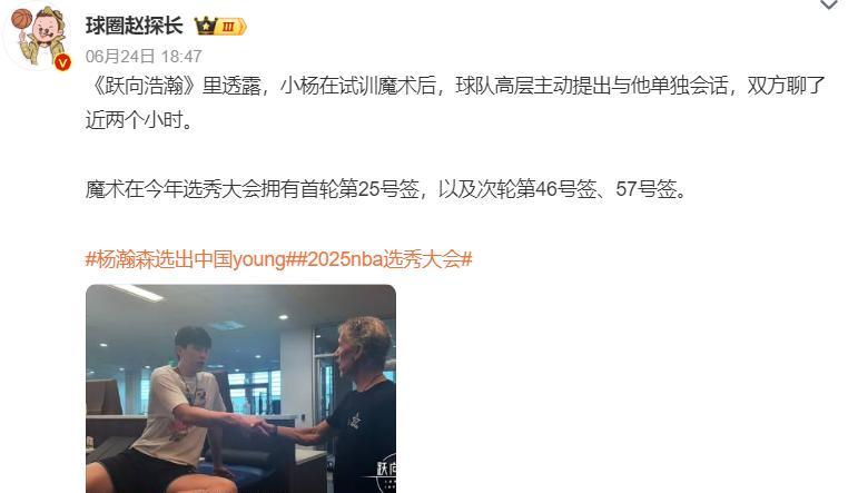 魔術在試訓完楊瀚森後,球隊高層主動找到楊瀚森談了兩個小時,魔術今年在選秀大會上還有手握25/46/57三個籤位。