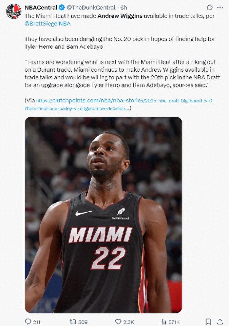 北京時間6月25日,根據NBA記者BrettSiegel的報道,邁阿密熱火隊已經將安德魯-維金斯與首輪20號籤擺上貨架,他們希望通過交易補強陣容,幫助希羅、阿德巴約在季後賽中走得更遠。