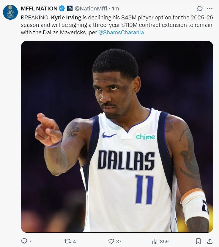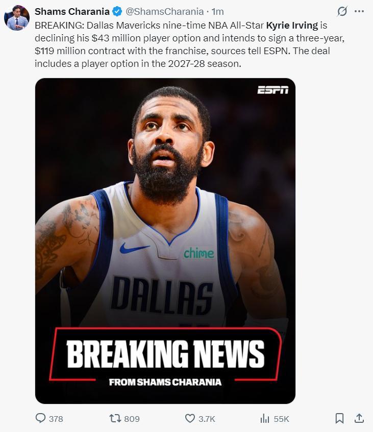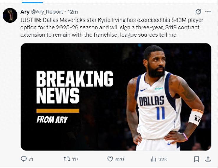 在Ary爆料12分鐘後,ESPN記者Shams纔跟蹤報道,歐文拒絕執行4300萬的球員選項與獨行俠達成三年1.19億的續約,這份合同包含了27-28賽季的球員選項,也就是說這份合同是2+1的合同。