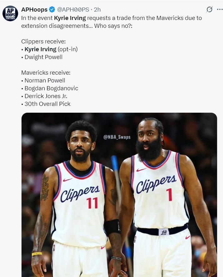 快船隊與湖人隊聽說歐文可能要進入自由市場、交易市場都已經開始招募了。快船媒體希望歐文執行球員選項,然後用鮑威爾、博格丹諾維奇、瓊斯、30號籤換來歐文+德懷特鮑威爾,快船的如意算盤落空了。