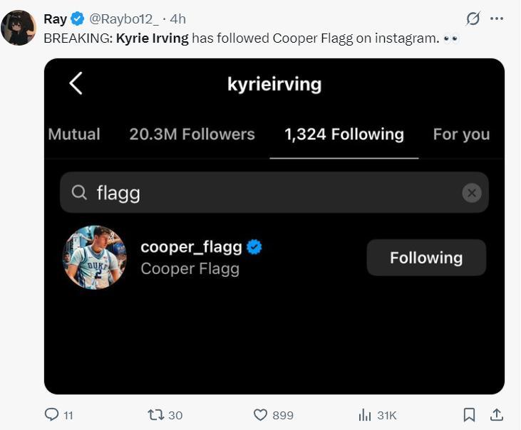 早在四小時之前,就有,美媒發現歐文在IG上關注了庫珀-弗拉格,這證明歐文即將回歸。