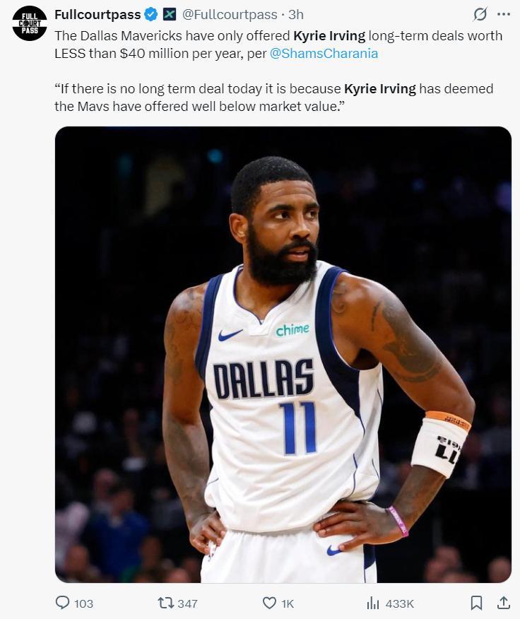 但Shams最先的爆料是——獨行俠只肯給歐文一份均薪低於4000萬的合同,這讓歐文團隊無法接受,一旦談不攏歐文有可能涉水自由市場。