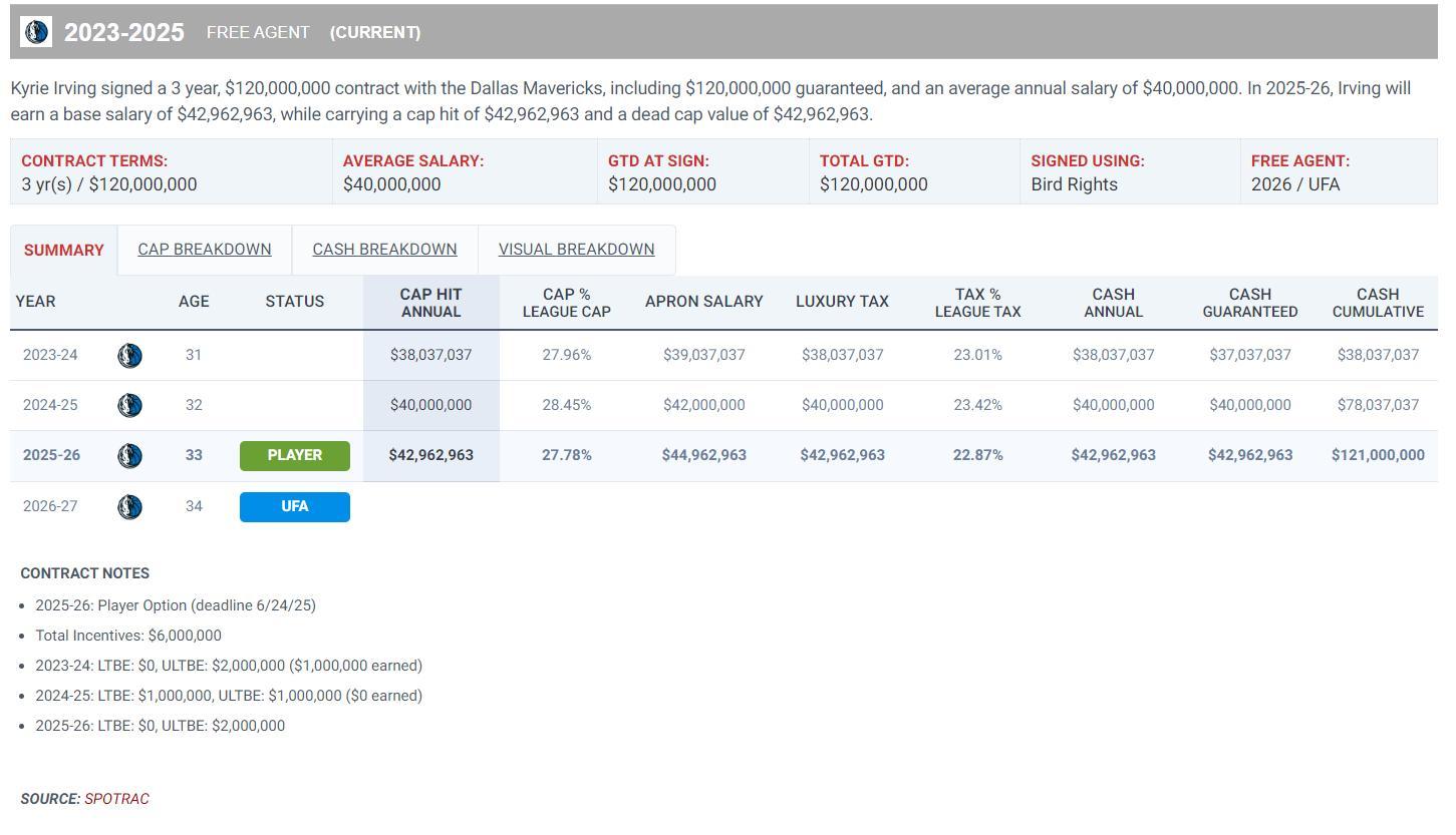 值得一提的是在2023年夏歐文與獨行俠簽下的合同也是3年1.2億,也是2+1合同,換言之歐文已經連續兩次跟獨行俠簽約類似的合同。