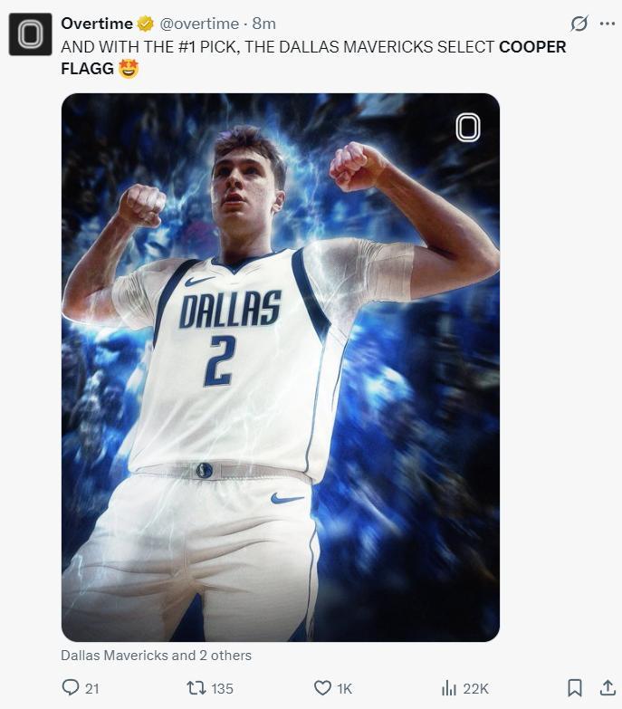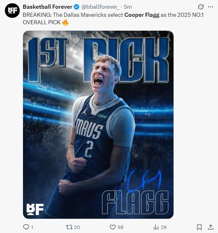 北京時間6月26日,NBA選秀大會,達拉斯獨行俠用狀元籤選中了庫珀-弗拉格,這可能是本屆選秀最沒有懸念的一次,因爲弗拉格在單獨試訓時只去了獨行俠,試訓之前的一晚他與獨行俠5個管理層一同進行晚宴。