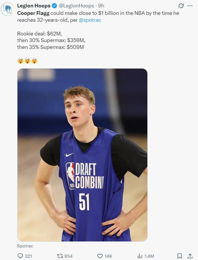 弗拉格狀元合同爲四年6270萬,如果他成爲聯盟的球星,他第一份續約會是工資帽30%也就是五年3.59億,第二份合同是工資帽35%也就是五年5.009億,換言之他32歲時將要賺接近10億美元。