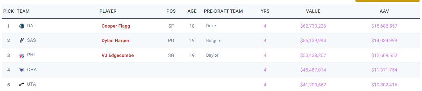 他原本預測是前五左右,如今成爲探花,合同從4100萬升至5000萬,等於多賺了接近1000萬美元。