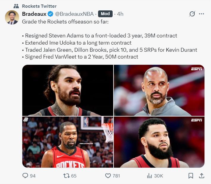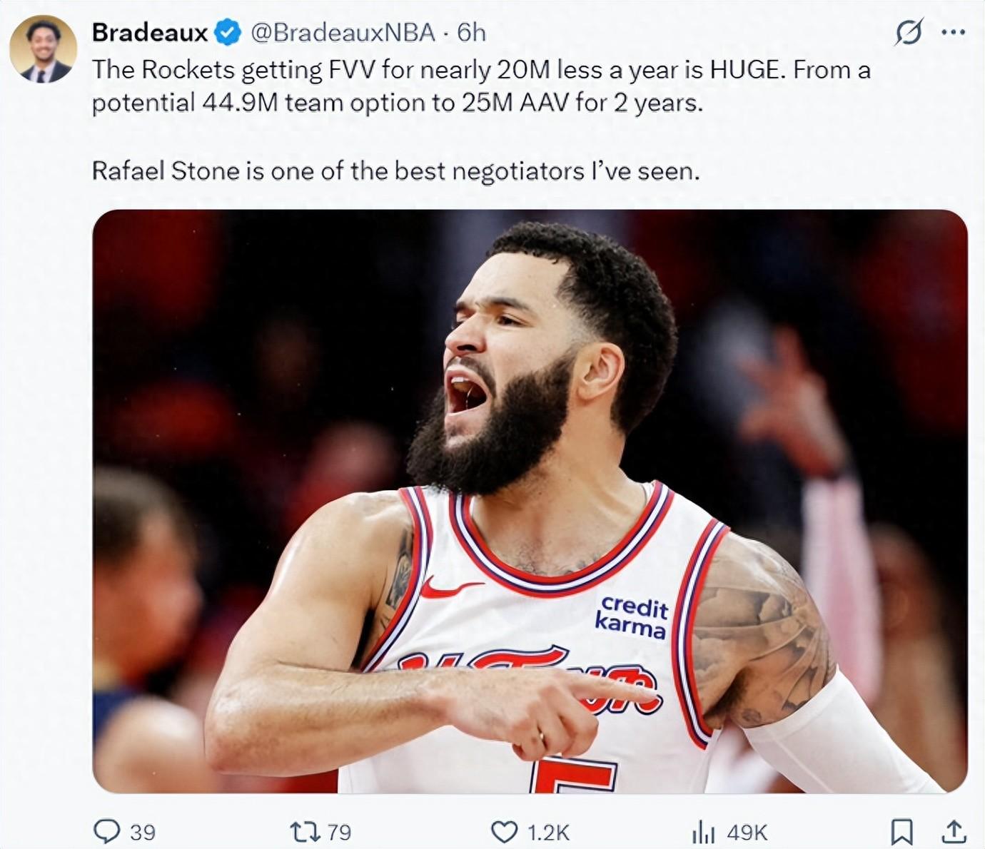 北京時間6月26日,根據ESPN名記Shams的報道,火箭隊拒絕執行範弗利特下賽季4490萬的球隊選項,他們與範喬丹簽下一份兩年價值5000萬的新合同,這份合同是1+1含有球員選項,範弗利特在2026年夏可以跳出合同成爲完全自由球員。
