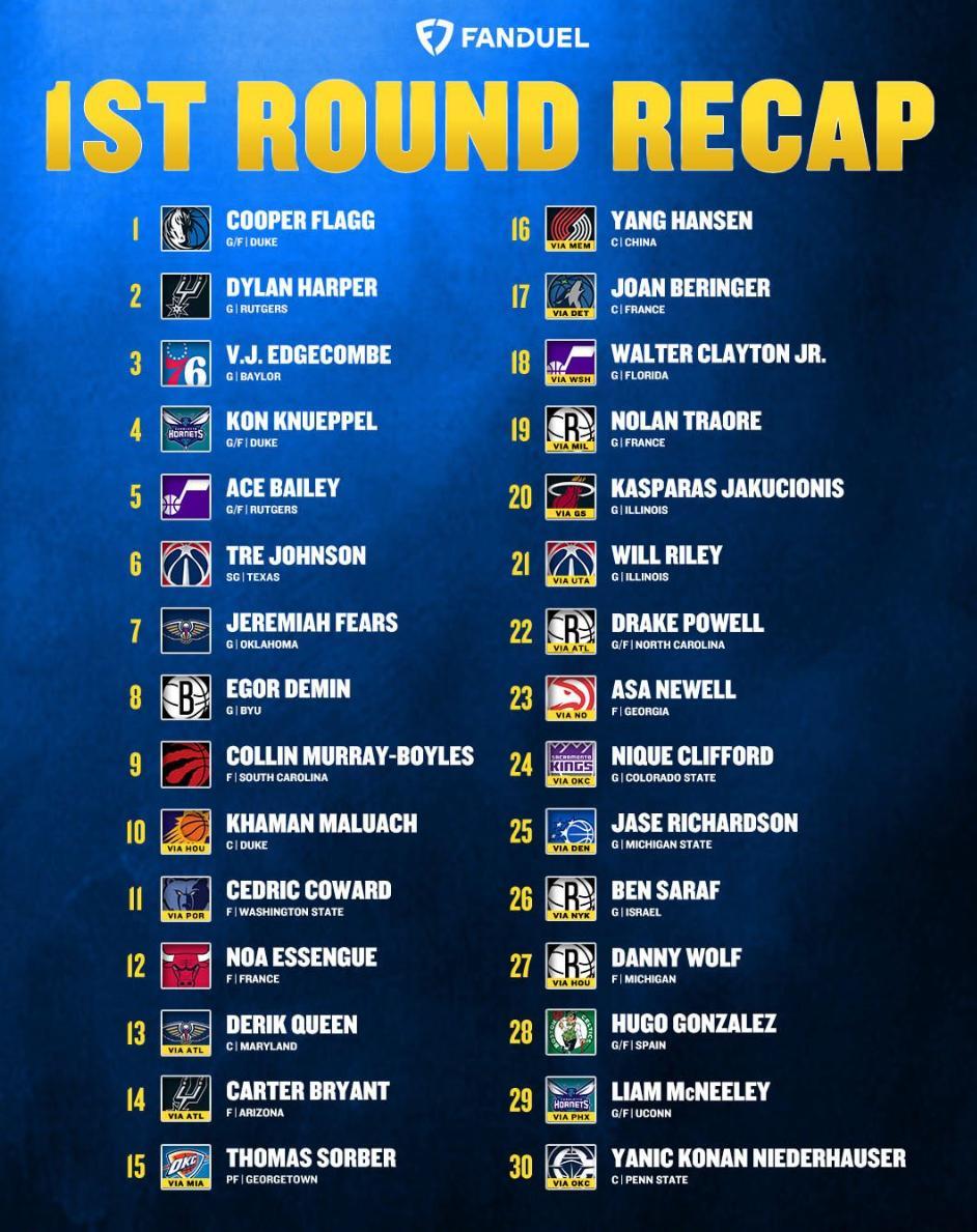 上圖是首輪30號籤的具體選擇:弗拉格、迪倫-哈珀、埃奇庫姆、克努佩爾、貝利、特雷-約翰遜、費爾斯、德明、博伊爾斯、馬魯阿奇、科沃德、艾格森、奎因、卡特-布萊恩特、索伯、楊瀚森、貝林格、克萊頓、特來奧雷、雅庫喬尼斯、萊利、鮑威爾、紐維爾、克利福德、理查森、薩拉夫、沃爾夫、岡薩雷斯、麥克尼利、尼德豪澤。