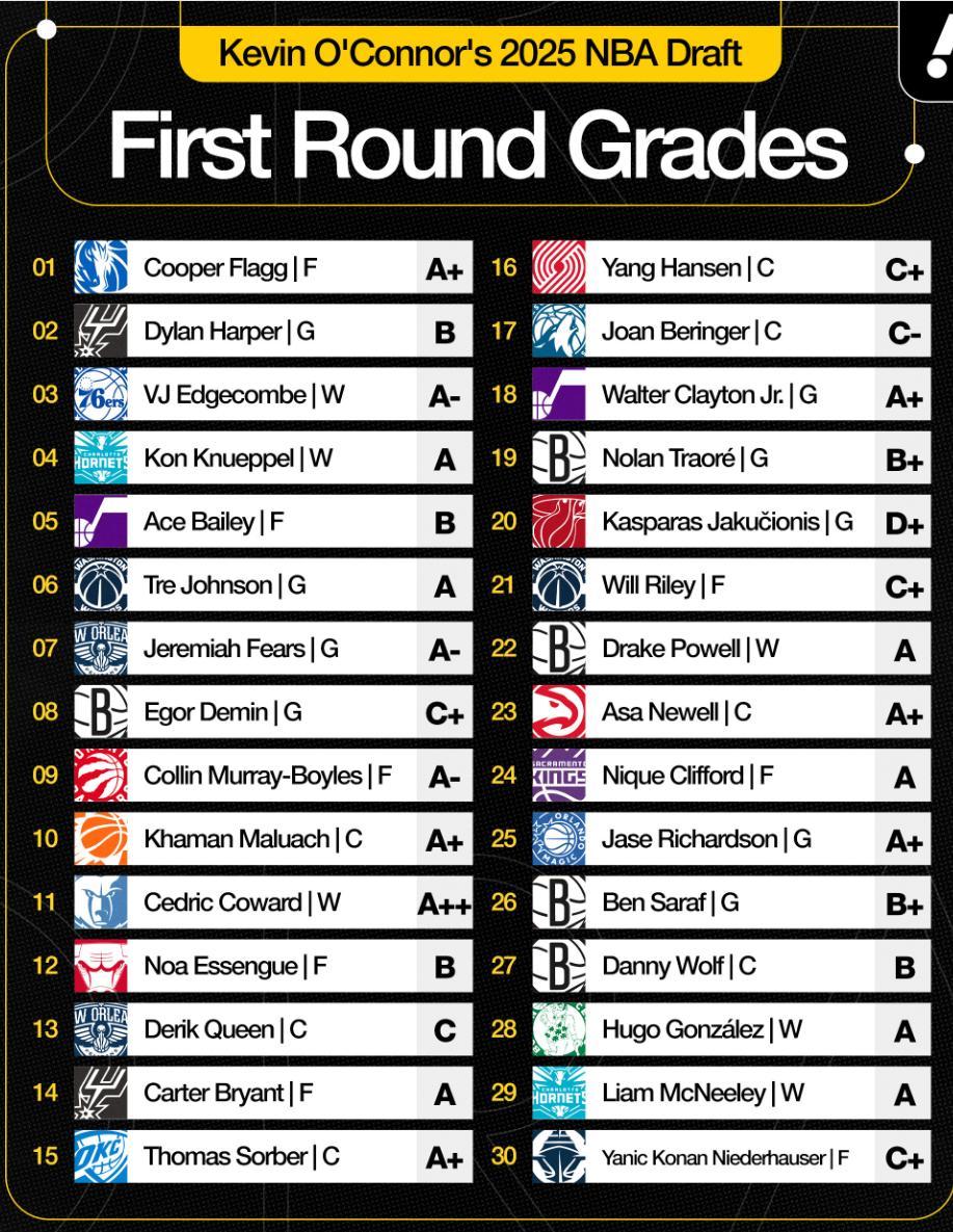 開拓者選楊瀚森C+;森林狼選貝林格C-;爵士選克萊頓A+;籃網選特來奧雷B+;熱火選雅庫喬尼斯D+;奇才選萊利C+;籃網選鮑威爾A;老鷹選紐維爾A+;國王選克利福德A;魔術選理查森A+;籃網選薩拉夫B+;籃網選沃爾夫B,綠凱選岡薩雷斯A、黃蜂選麥克尼利A、快船選尼德豪澤C+