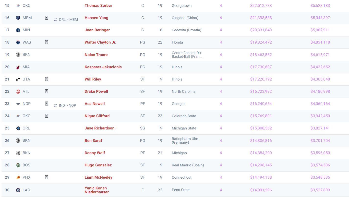 第15順位-30順位的薪資情況:索伯四年2251萬、楊瀚森四年2139萬、貝林格四年2033萬、克萊頓四年1932萬、特拉奧雷四年1846萬、雅庫喬尼斯四年1773萬、萊利四年1722萬、鮑威爾四年1672萬、紐維爾四年1624萬、克利福德四年1576萬、理查森四年1530萬、薩拉夫四年1480萬、沃爾夫四年1438萬、岡薩雷斯四年1429萬、麥克尼利四年1419萬、尼德豪澤四年1409萬。