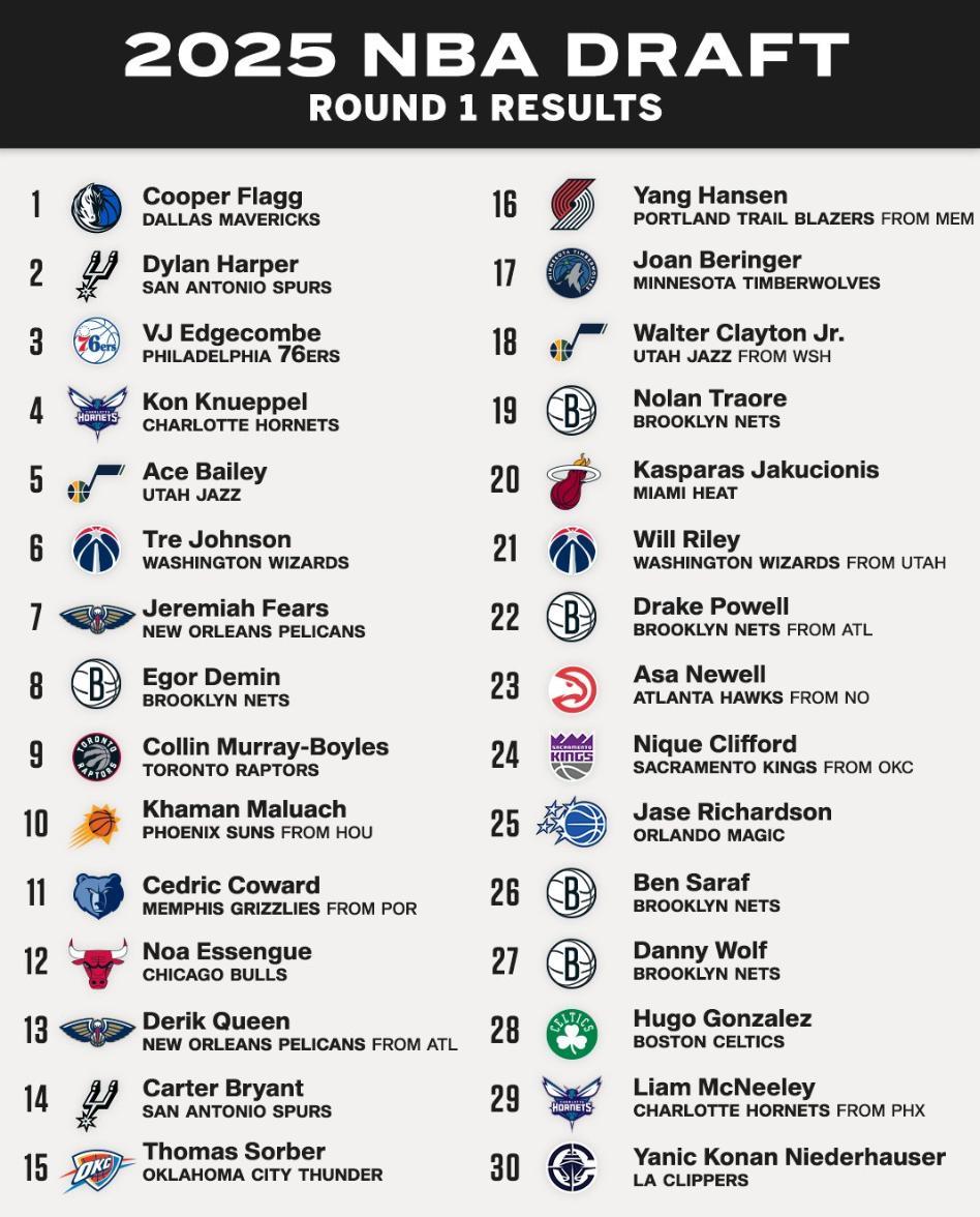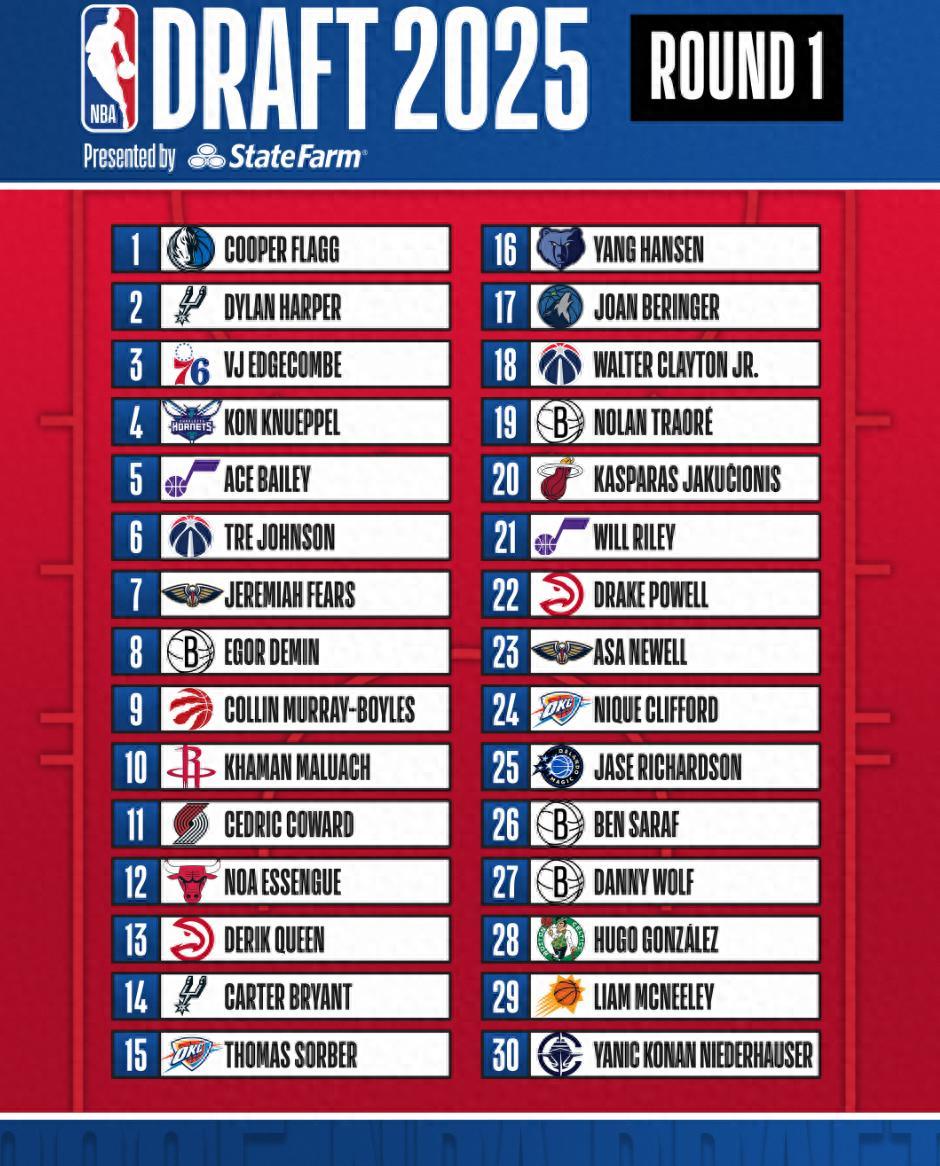 2025年NBA首輪選秀已經圓滿結束了,楊瀚森在首輪第16順位被開拓者選中,他成爲姚明、阿聯後第三位中國首輪秀球員,弗拉格、哈珀、埃奇庫姆等天才分別以狀元、榜眼、探花進入NBA。
