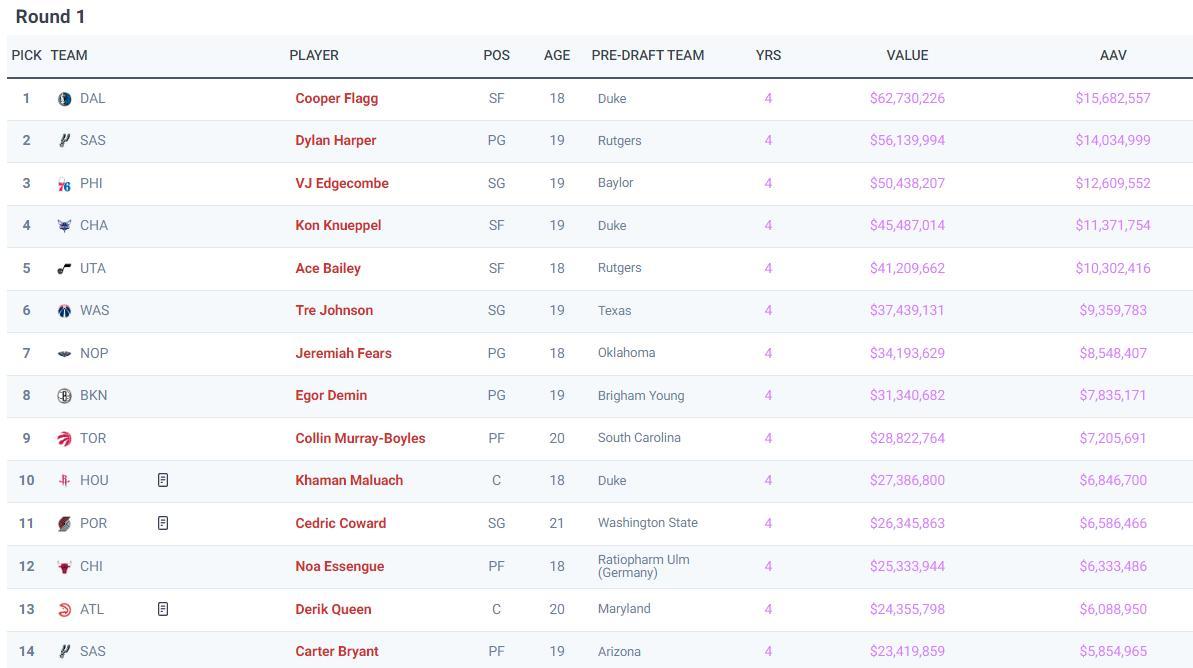 這30名首輪秀出現後,他們的薪資問題也一同出爐,弗拉格肯定是賺最多的那個,因爲他的狀元合同超過6000萬美元創造新的NBA紀錄,去年的狀元裏薩謝是四年5700萬。