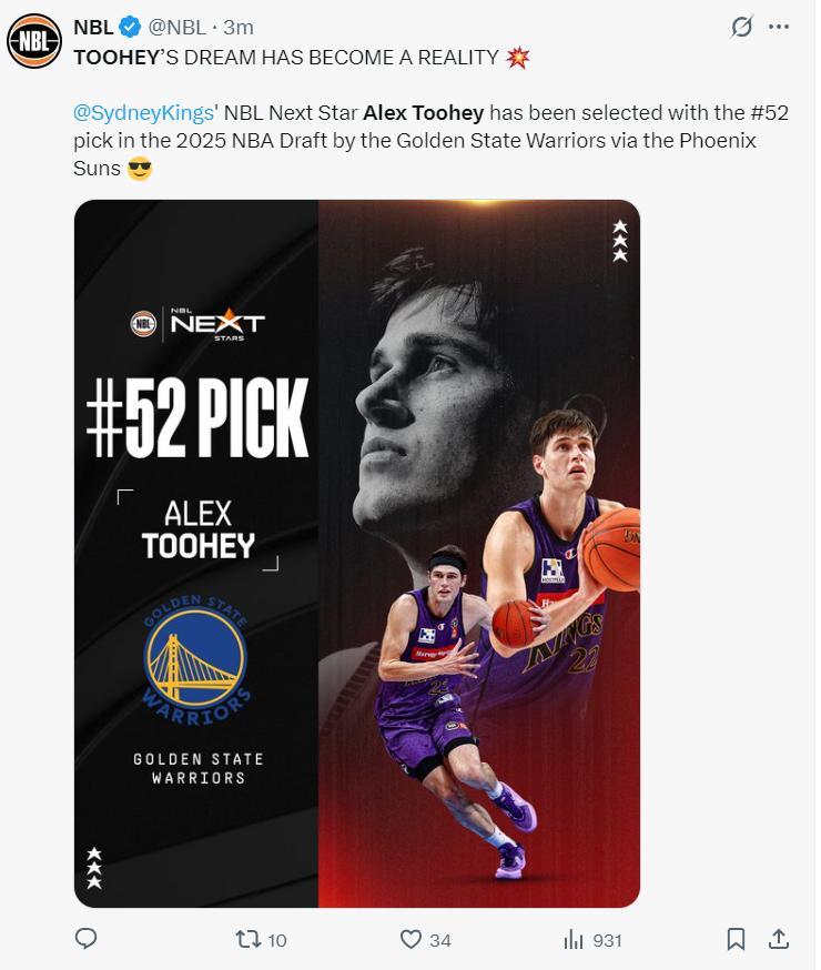 北京時間6月27日,NBA次輪選秀大會,太陽31順位選到弗萊明,湖人36順位選中蒂耶羅,太陽41號籤選了科比-佈雷亞,勇士52順位選了亞歷克斯-圖希,勇士56順位威爾-理查德。