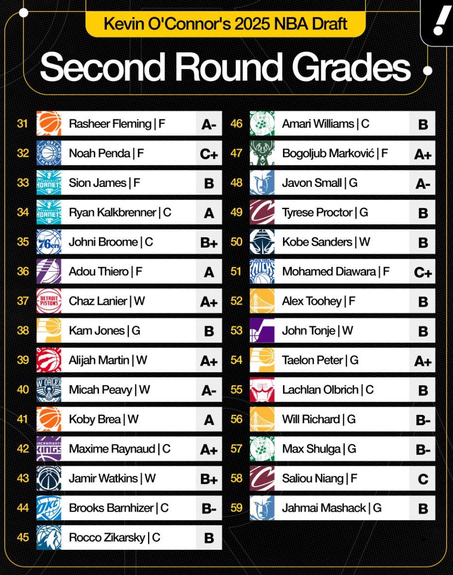 國王42順位選中雷諾A+;奇才43順位選中賈米爾-沃特金斯B+;雷霆44順位選中布魯克斯-巴恩希爾B-;森林狼45順位選中齊卡爾斯基B;凱爾特人46順位選中阿瑪裏-威廉姆斯B;雄鹿47順位選中馬爾科維奇A+;