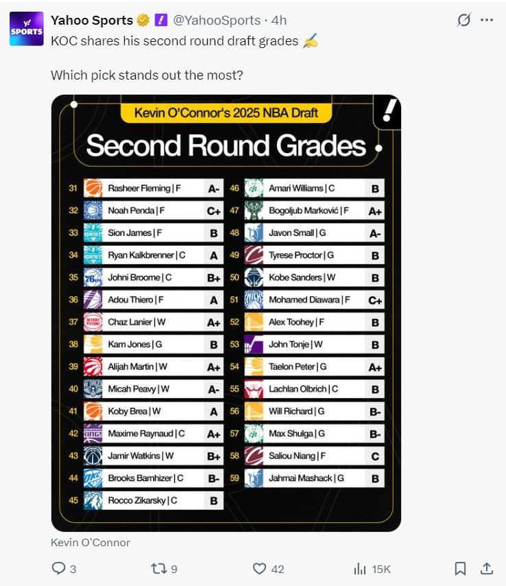 北京時間6月27日,NBA次輪選秀大會完結,今年的次輪選秀有29個籤位,尼克斯因爲之前的違規被罰掉了次輪所以只有29個,雅虎體育專家凱文-奧康納也爲這29個籤位進行了選秀評級。