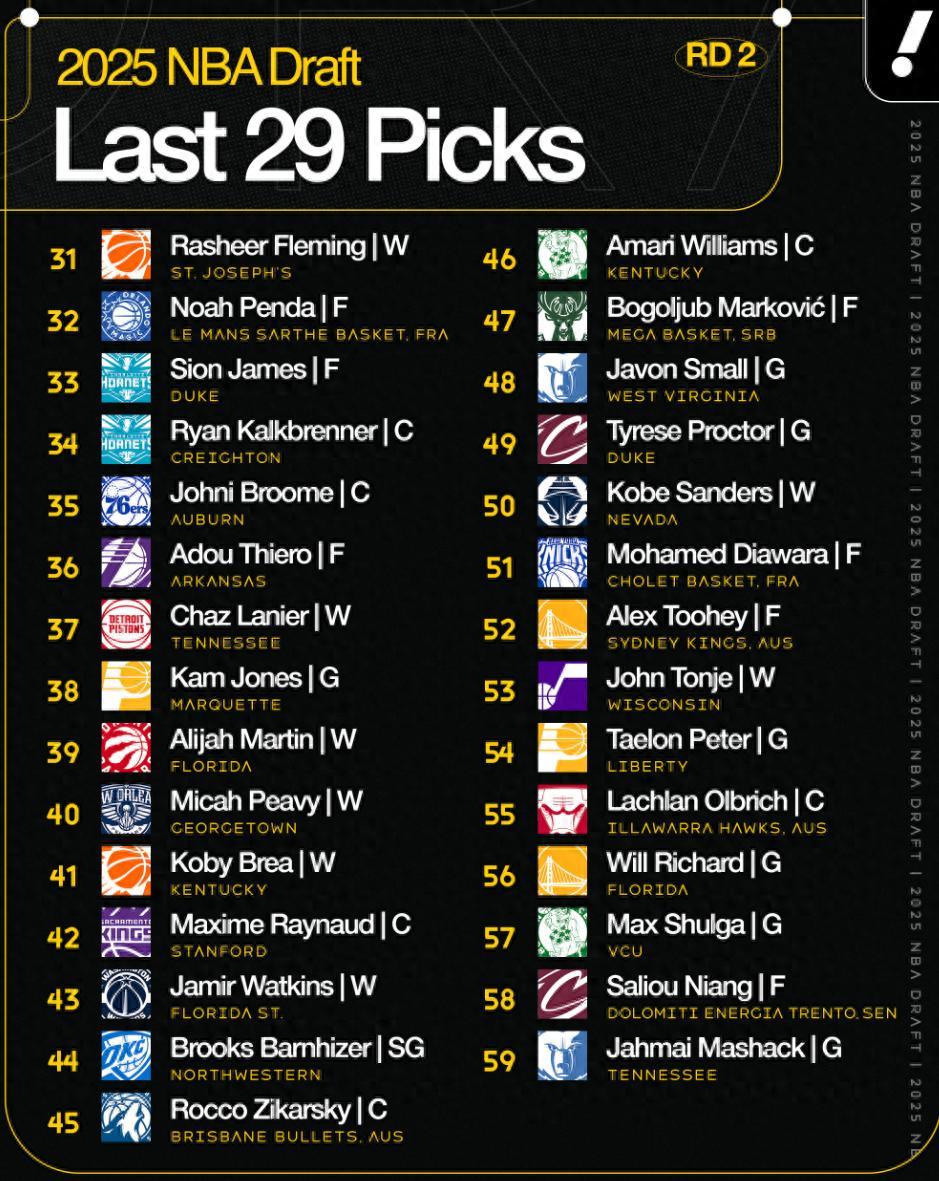 步行者54順位選中卡倫-皮特A+;公牛55順位選中了拉克西-奧爾布里奇B;勇士56順位威爾-理查德B-;魔術57順位馬克斯-舒爾加B-;騎士58順位薩利烏-尼昂C;灰熊59順位賈麥-梅沙克B;