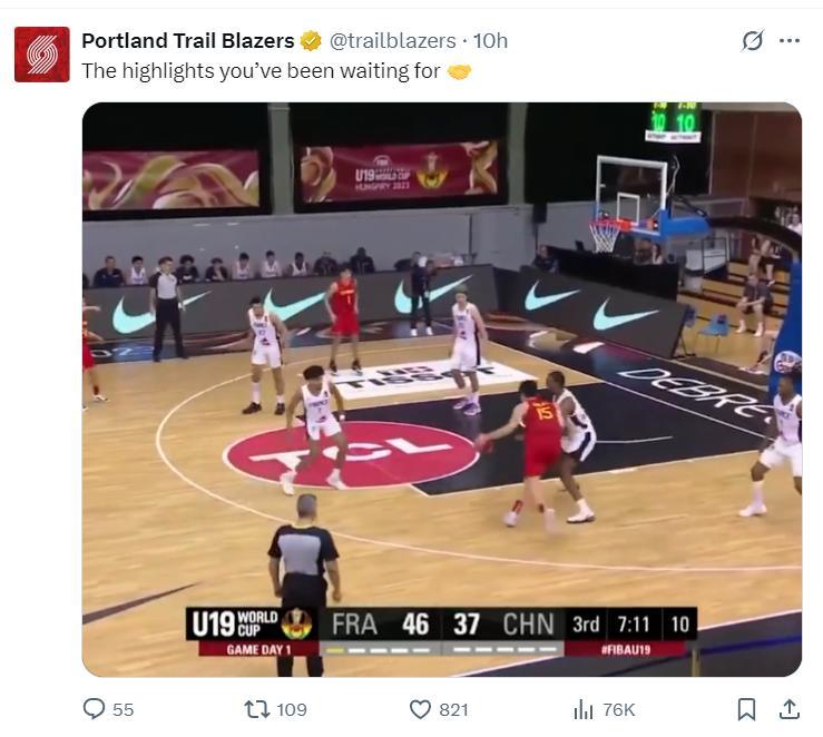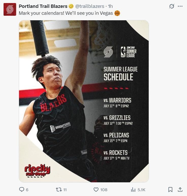 新聞發佈會後開拓者官方曬出了球隊夏季聯賽的賽程,北京時間7月12日對陣勇士,北京時間7月13日對陣灰熊、北京時間7月15日對陣鵜鶘、北京時間7月18日對陣火箭。(海報是楊瀚森試訓時的扣籃)
