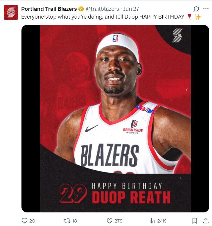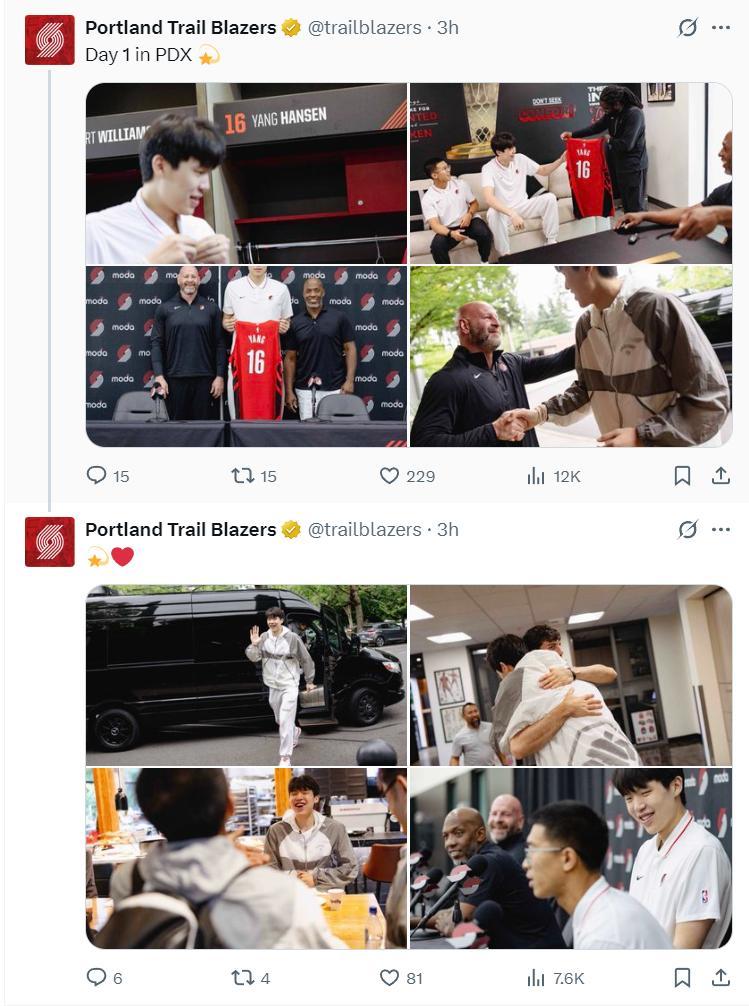 很明顯楊瀚森已經成爲開拓者的團寵了,甚至是撕裂之城的團寵,自6月26日楊瀚森16順位被選中以來,開拓者官方的27條推文有25條是楊瀚森。