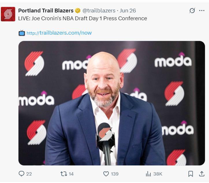 6月26日的一條推文是開拓者GM喬-克羅寧談球隊選秀大會的一些願景。