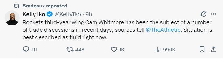 除此之外,火箭TA記者凱利-伊科還透露,在火箭隊交易掉狄龍後,球隊希望用惠特莫爾換回一個跟狄龍一樣的防守老將,有很多支球隊都有意白魔這位三年級生。