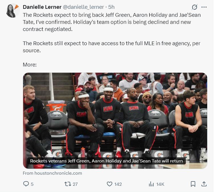 隨後《休斯頓紀事報》記者Danielle Lerner透露,就算休斯頓火箭隊同時續約格林、霍勒迪、泰特三人後球隊依舊保留了一份價值1410萬的全額中產特例。