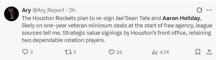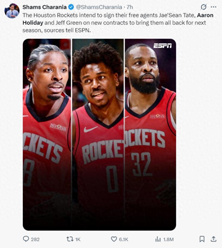 北京時間6月28日,ESPN記者Shams透露,火箭隊將與三位老將續約——傑夫-格林、阿龍-霍勒迪、傑肖恩-泰特,這三人將重返休斯頓輔佐全新的三巨頭杜蘭特、申京、阿門-湯普森。