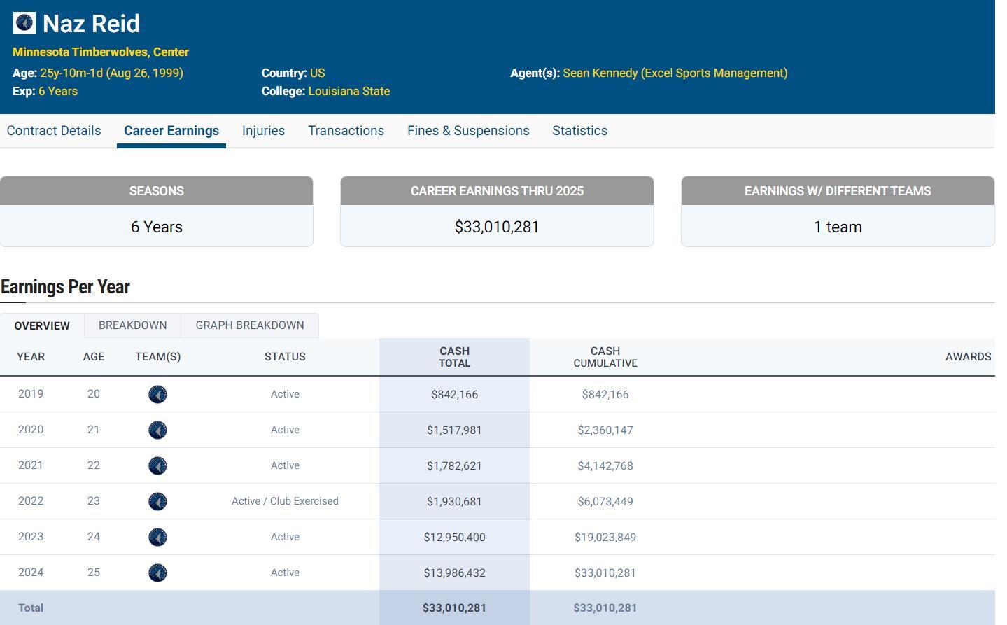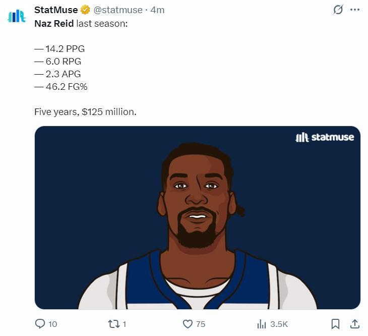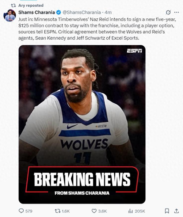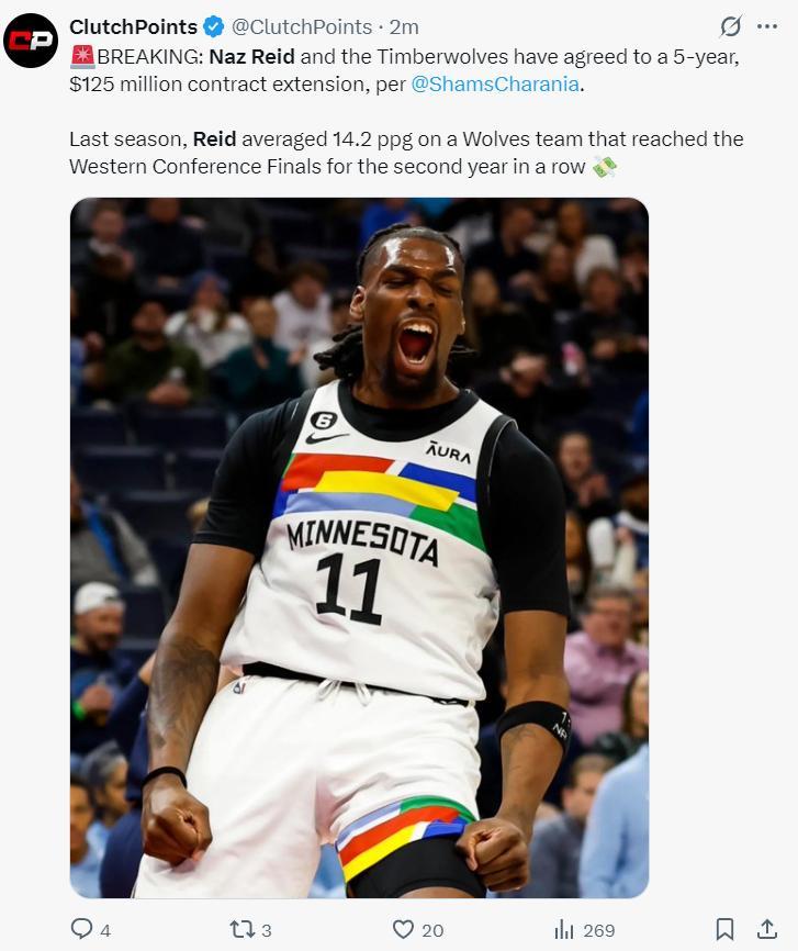北京時間6月28日,ESPN名記Shams報道,明尼蘇達森林隊將與納茲-裏德簽下一份五年價值1.25億的新合同,這份合同均薪達到2500萬美元,這份合同還是4+1的合同包含球員選項。他是森林狼過去三個賽季替補席最關鍵的貢獻者。