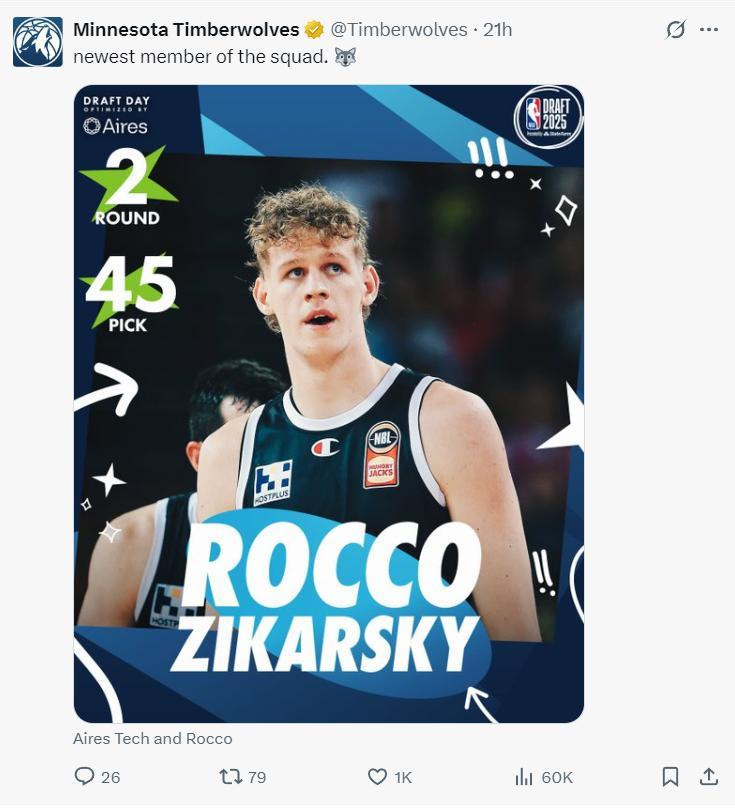 森林狼45號籤選中的是身高2.21米的齊卡爾斯基,在選秀後與他簽下雙向合同,他的臂展7尺5,上賽季在NBL場均12.2分鐘,拿4.7分3.5籃板0.3助攻0.7蓋帽0.3搶斷,命中率50%,三分命中率20%,也有一定的三分球能力。但這兩人都不是即戰力。