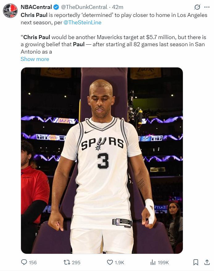 北京時間6月28日,根據馬克-斯坦恩的報道,克里斯-保羅決心下賽季在離家(洛杉磯)近的地方打球,達拉斯獨行俠是有意保羅的一支球隊,很多人相信保羅在他39歲時會重返洛杉磯開啓生涯第21個賽季。