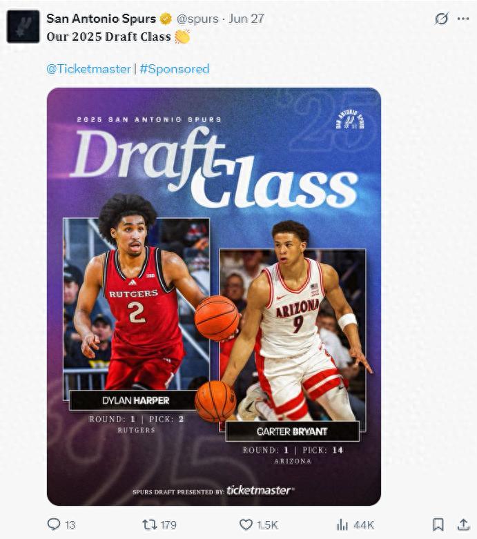 2025年選秀大會上馬刺手握榜眼籤與14號籤,最終榜眼籤選中了來自羅格斯大學的迪倫-哈珀,14號籤選中了來自亞利桑那大學的卡特-布萊恩特,這兩人都是天賦滿滿的超級新人。
