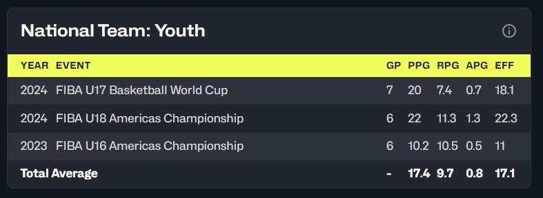 去年的U17世青賽,克洛普場均20分7.4籃板0.7助攻,去年的U17美洲盃他場均22分11.3籃板,這位2.04米18歲的年輕鋒線得分能力太強。