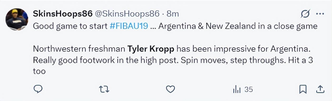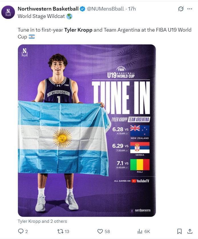 西北大學也在17小時前預熱了阿根廷U19男籃的賽程,克洛普從多支籃球名校中選擇了西北大學,他25-26賽季將代表西北大學打球,明年他應該就會參選NBA。
