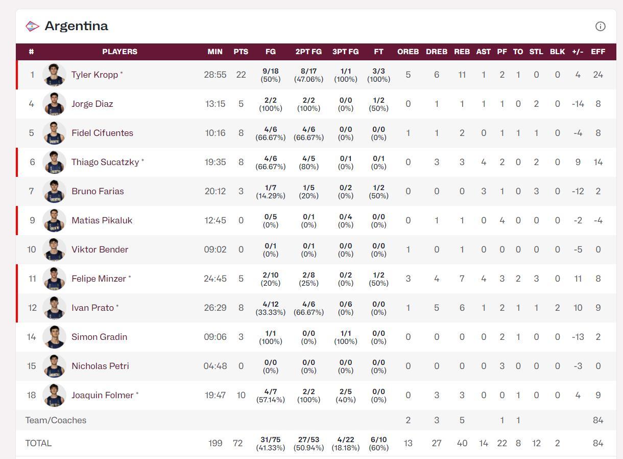 大家看看得分分佈就知道這支阿根廷男籃多麼拉胯,全隊僅兩人得分上雙,還有三人得分掛零,克洛普全場比賽29分鐘,18中9,三分1中1,拿到22分11籃板(5個前場)1助攻僅1失誤,命中率50%,三分命中率100%。