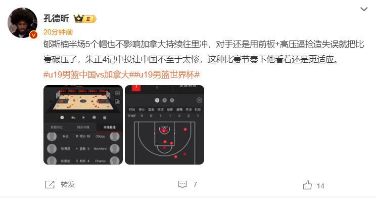 孔德昕說:郇斯楠半場5個蓋帽也不影響加拿大突破,對手的前場籃板+逼搶拿到太多的球權,朱正是唯一進攻端正常的球員,這個節奏他很適應。