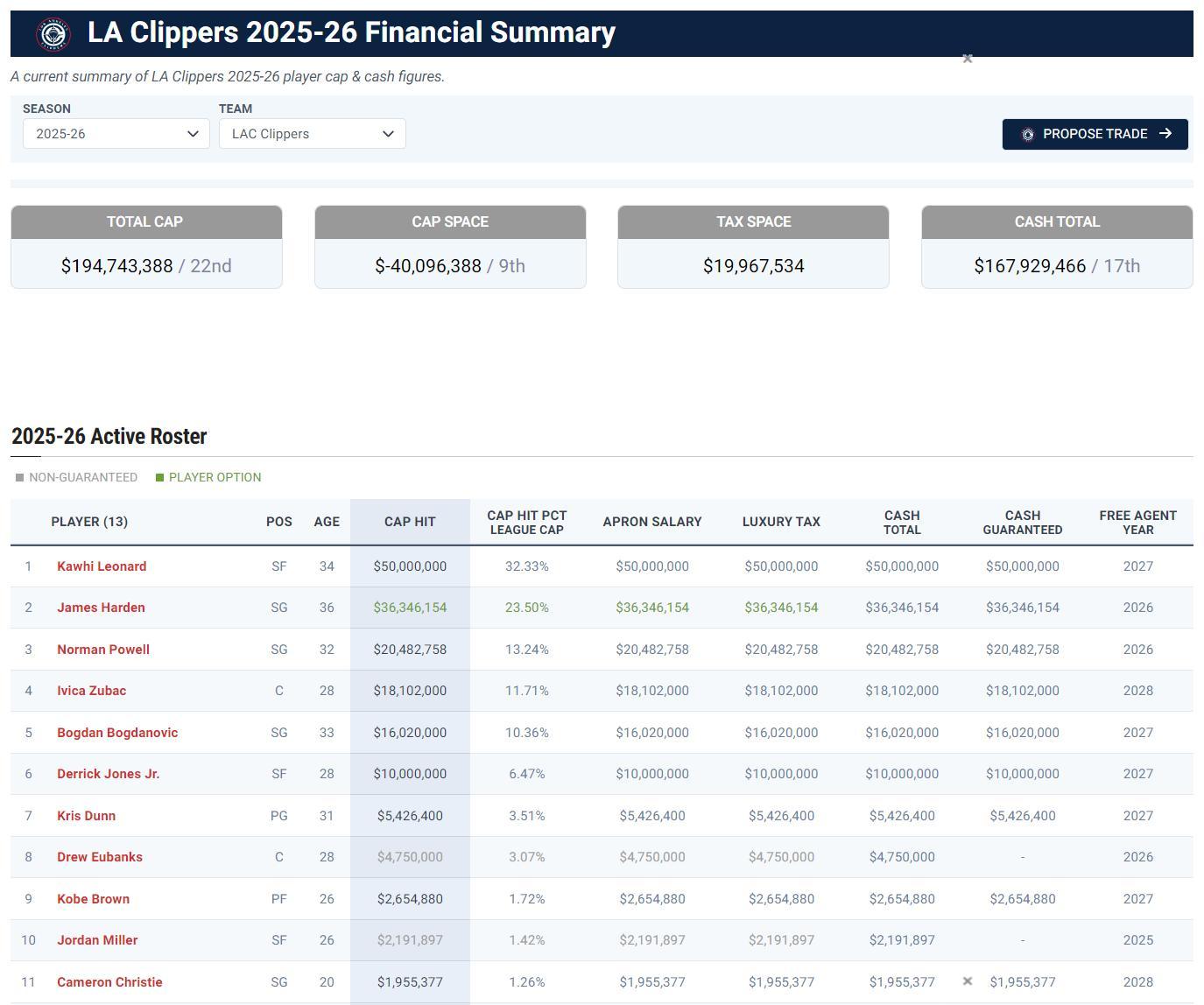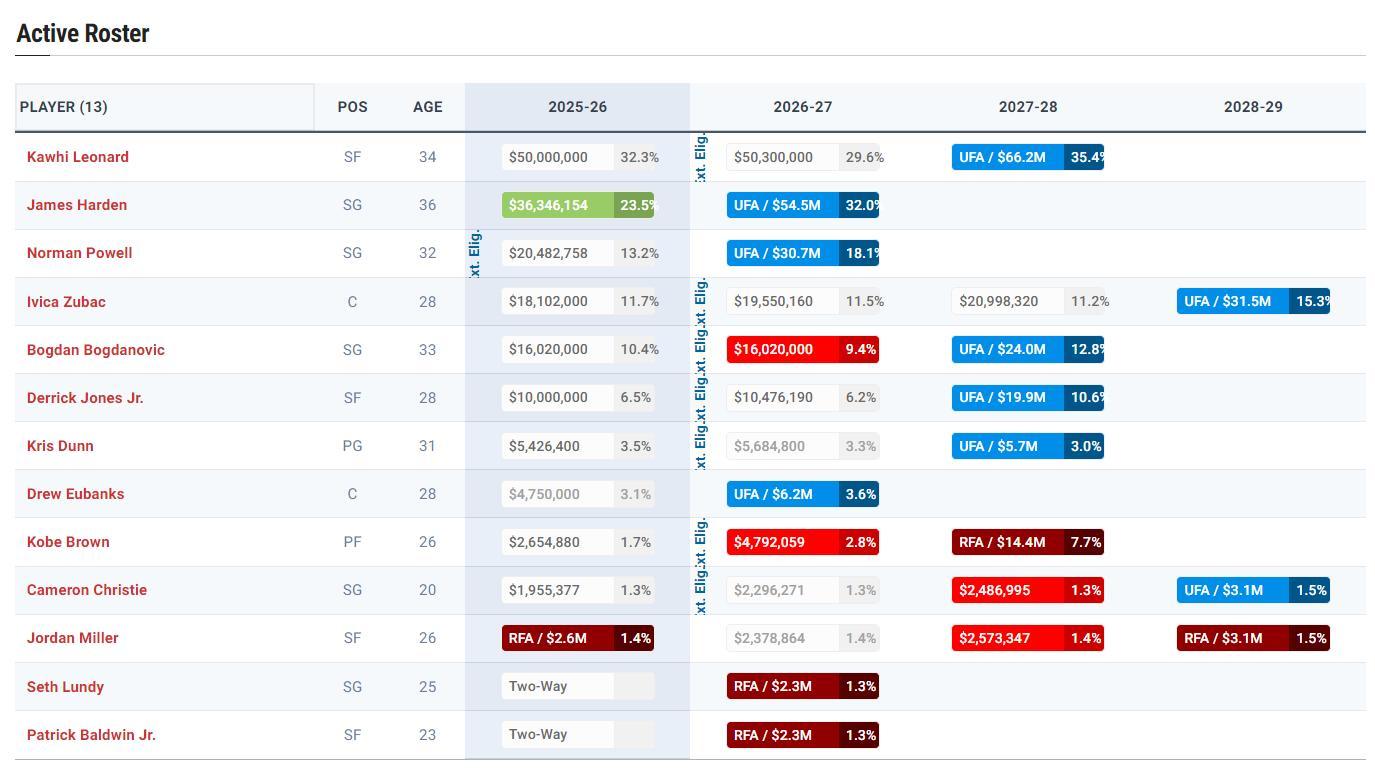 哈登目前是3634萬的球員選項,倫納德還剩兩年的合同,下賽季5000萬,26-27賽季5030萬。這兩人就是快船的核心,除了這兩人球隊中還沒有人超過3000萬。