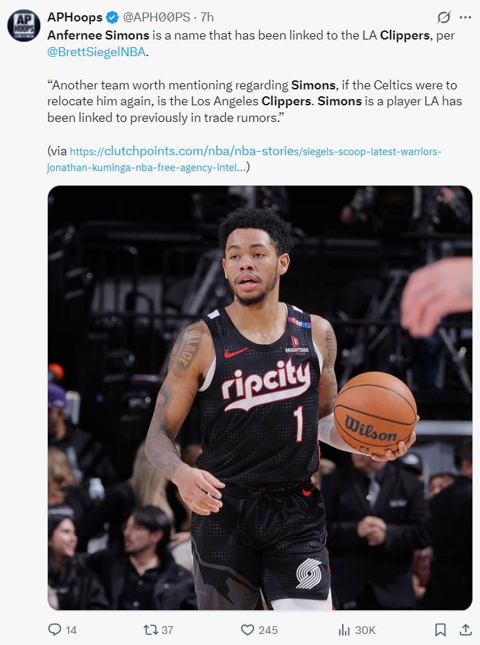 早些時候NBA記者BreeSiegel透露,如果凱爾特人要再度交易安芬尼-西蒙斯那麼快船是對他有意的球隊,西蒙斯2700萬的到期合同對快船有一定的吸引力,諾曼-鮑威爾是快船今夏主要的交易籌碼之一。