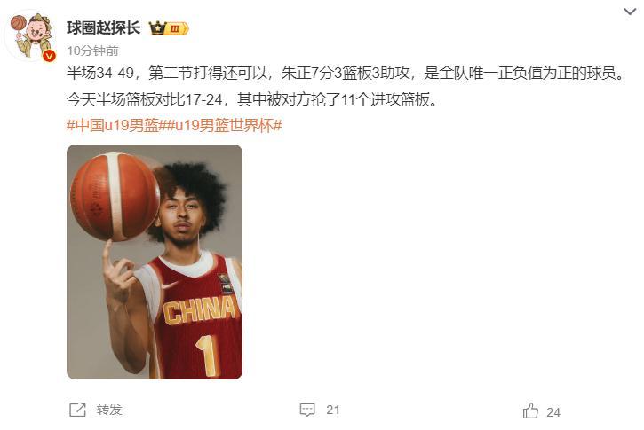 上半場朱正是全隊唯一正負值爲+的那個,他出戰10分鐘,6中3+三分2中1拿到7分3籃板3助攻,第二節中段他2分2助攻幫助中國隊打出10-0,但隨後他被換下後德國直接一波11-4再度拉開分差。