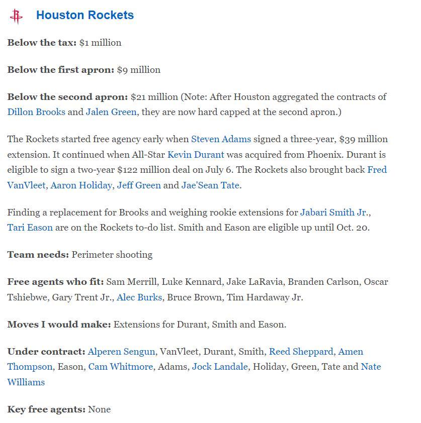 火箭價值1410萬的全額中產肯定會留給更需要的角色,ESPN認爲:盧克-肯納德,傑克-拉拉維亞,布蘭登-卡爾森,奧斯卡-奇布維,小加里-特倫特,亞歷克-伯克斯、布魯斯-布朗,小蒂姆-哈達威8人都是不錯的選擇。
