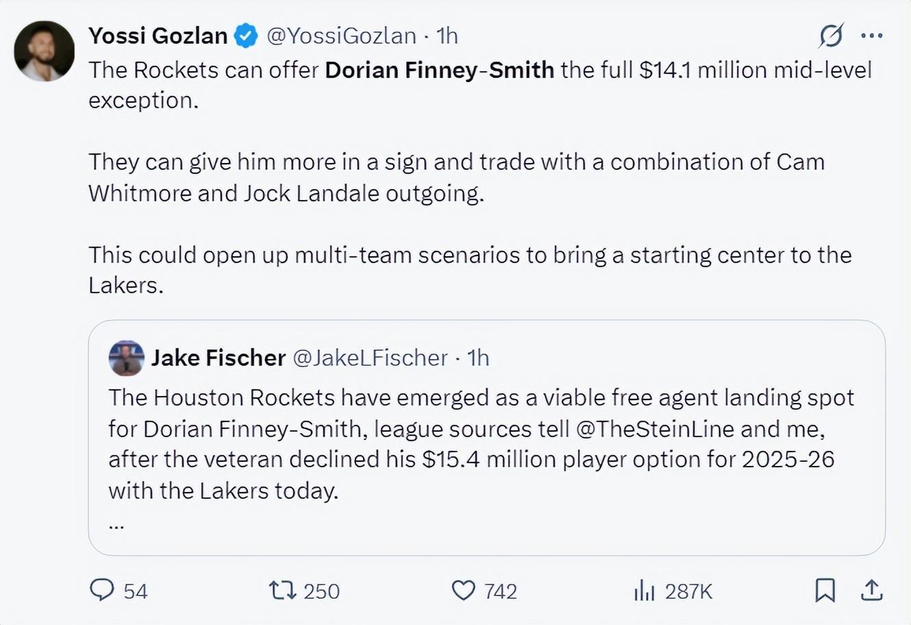 隨後馬克-斯坦恩與傑克-費舍爾聯合報道,休斯頓火箭隊成爲芬尼-史密斯最可能得落腳地。