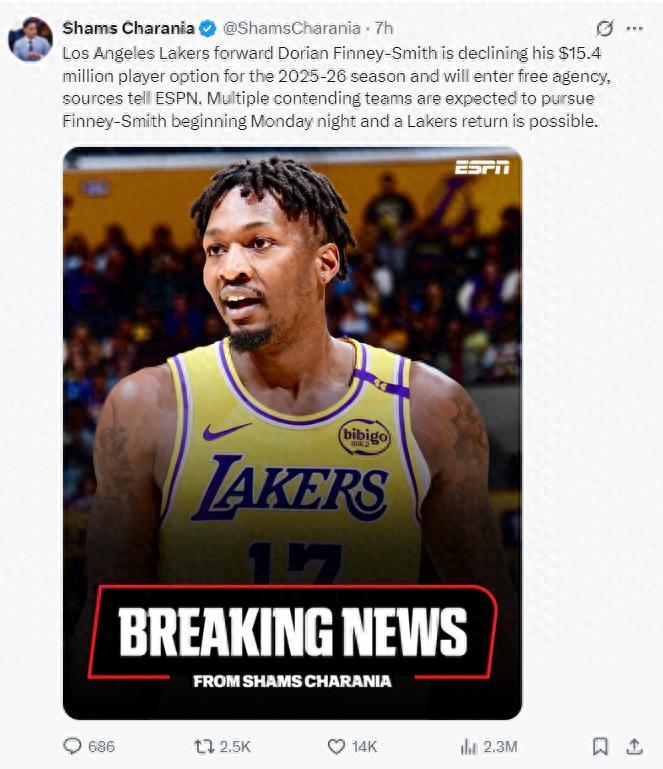 北京時間6月30日,ESPN名記Shams報道,洛杉磯湖人隊前鋒芬尼-史密斯已經決定拒絕執行他25-26賽季價值1540萬的球員選項,他會成爲完全自由球員涉水自由市場,湖人隊也因爲他的離隊將有一份奢侈稅全額中產可以使用。