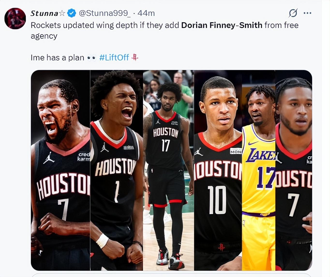 休媒曬出如果火箭引進芬尼-史密斯後的鋒線組合——杜蘭特、阿門、伊森、小賈巴里、芬尼史密斯、惠特莫爾。