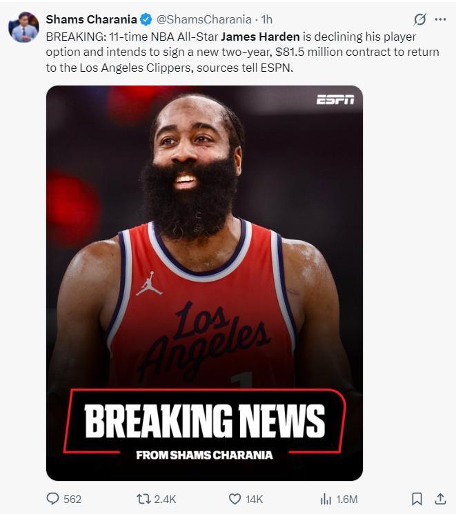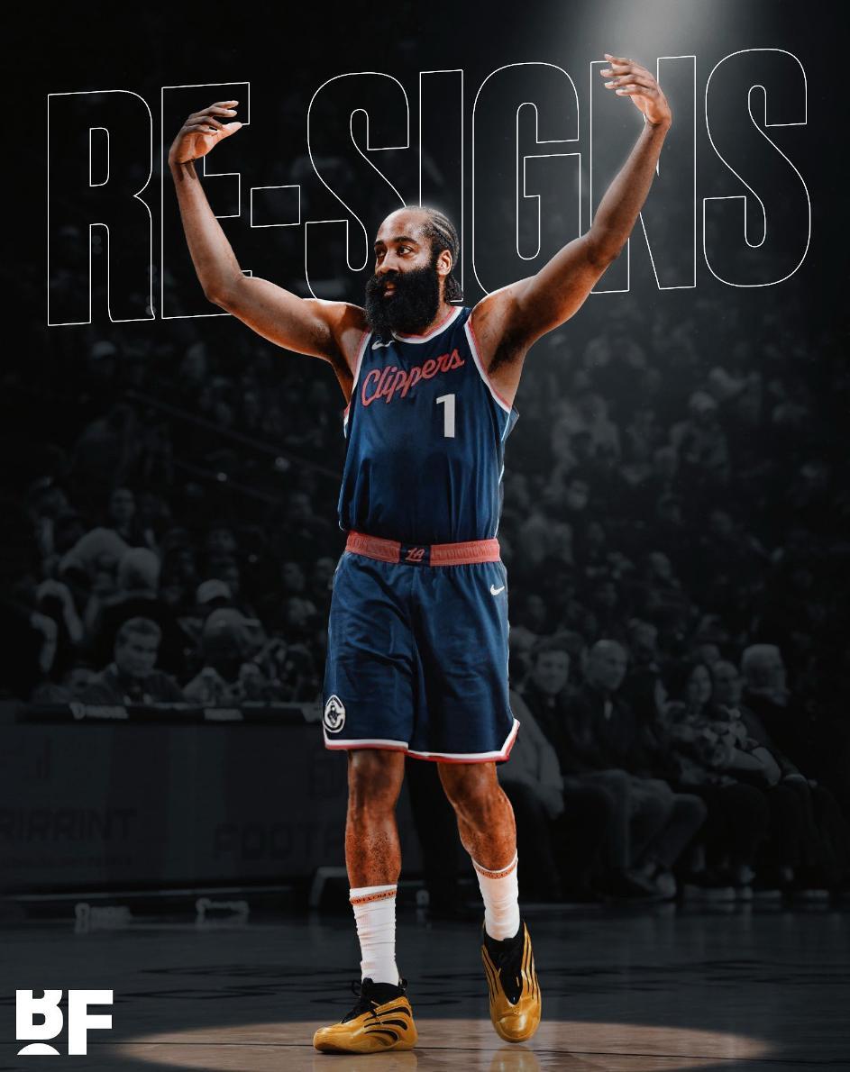 北京時間6月30日,根據ESPN的報道,詹姆斯-哈登已經與快船達成一份新的續約合同,這份合同是兩年8150萬第二年爲球員選項。因爲哈登跳出合同被38歲條款所限制,所以他與快船的續約至多兩年。