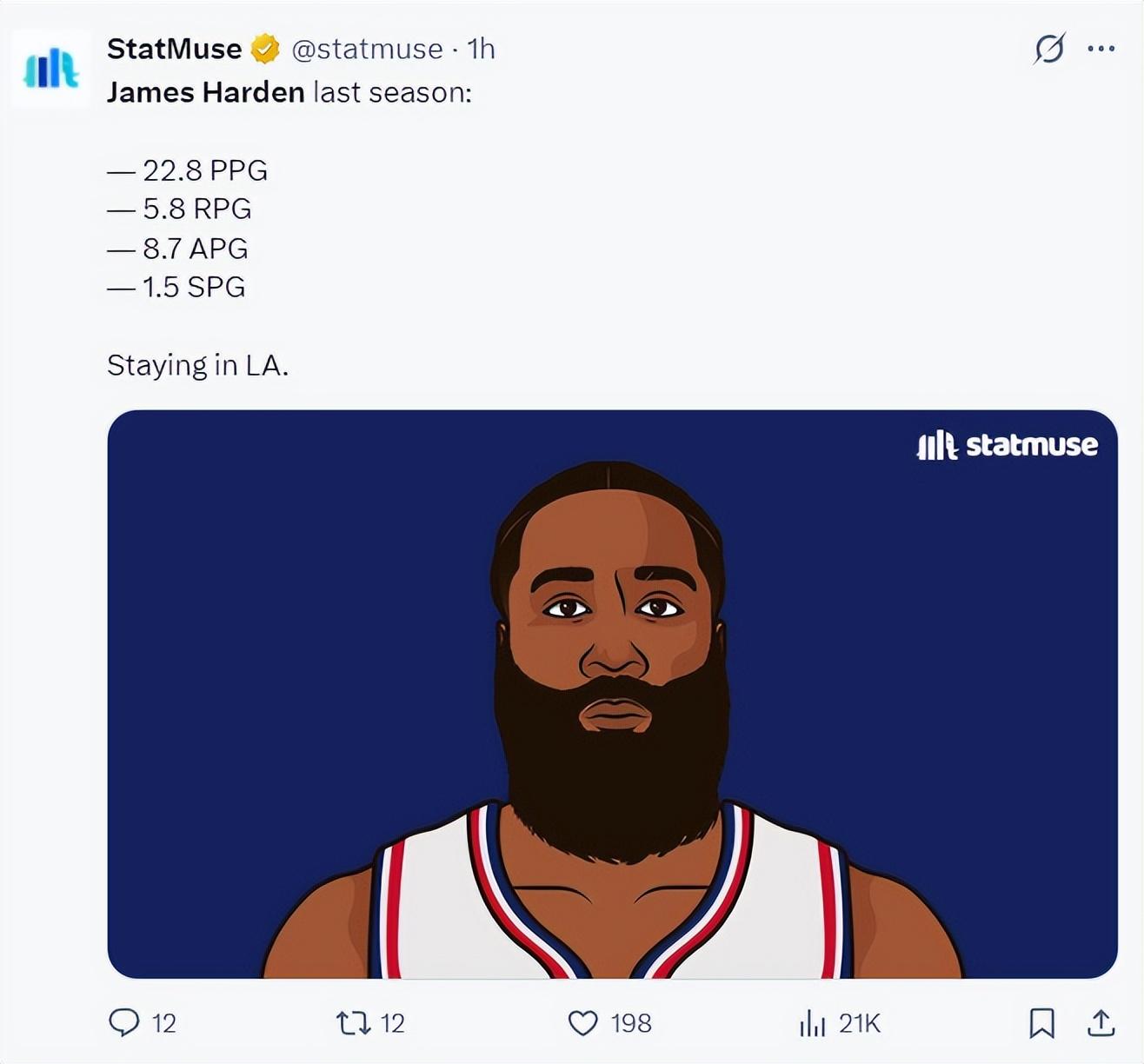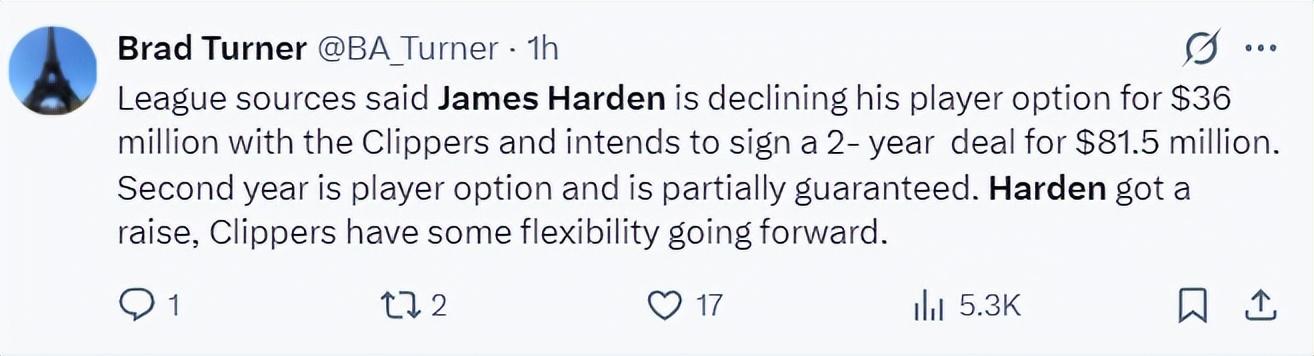 洛杉磯記者伯德-特納寫道:哈登得到了一定程度的加薪,快船也保持了薪金空間的靈活性。