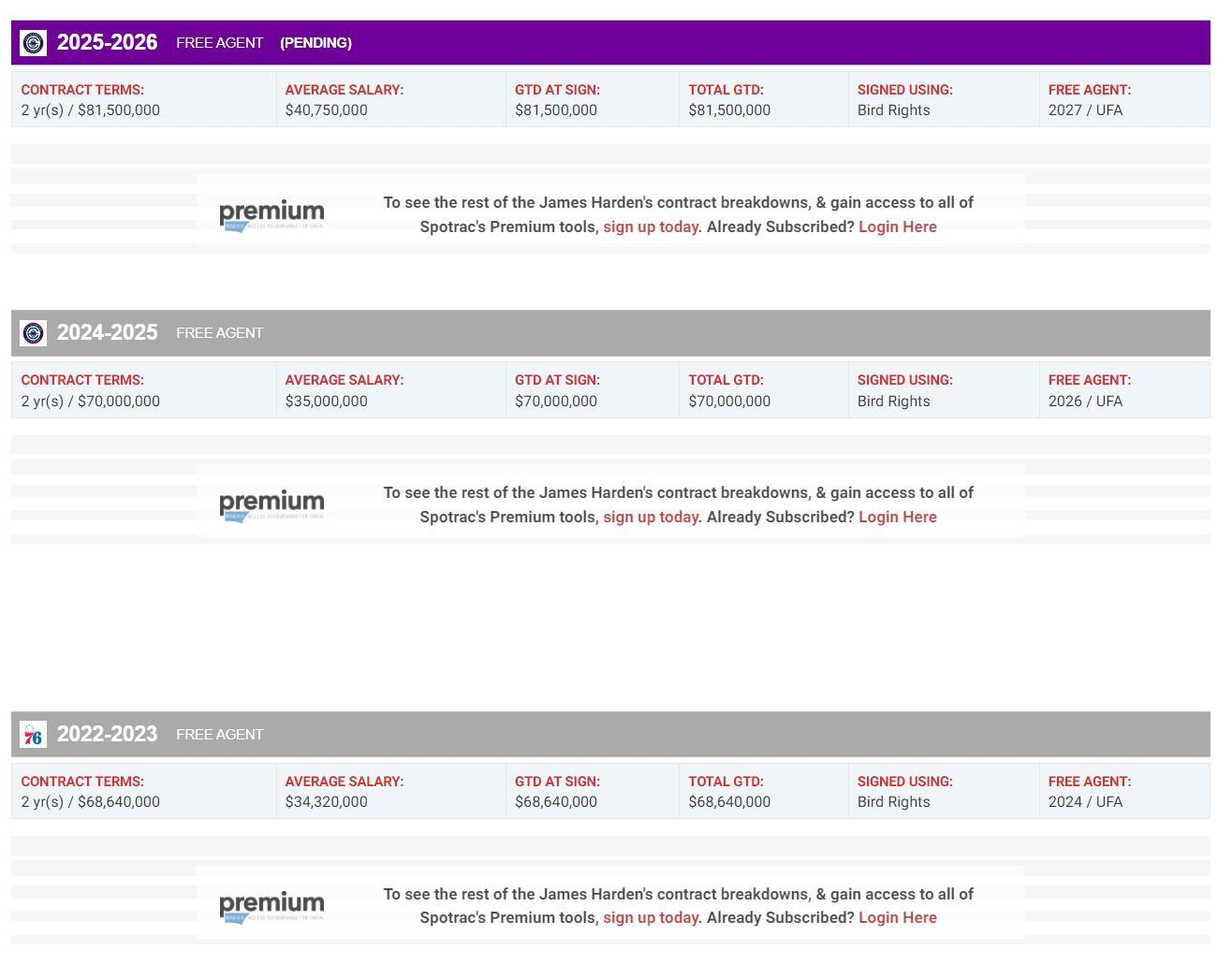 自2017年-2021年與火箭簽下四年1.71億的頂薪後,哈登再也沒有簽下過頂薪合同,2022-23賽季是兩年6864萬、24-25賽季是兩年7000萬,25-26賽季是兩年8150萬。