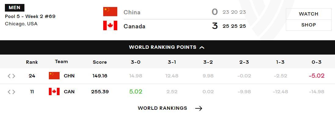 世界排名24的中國隊0-3加拿大隊後又-5.02分,中國男排這第二週是一場比賽沒有贏,全隊的士氣十分低落。