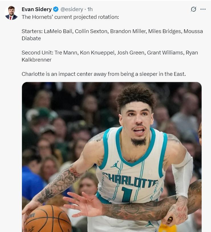 埃文-斯迪瑞還表示黃蜂新賽季的10人輪換應該已經確定——先發:拉梅洛、塞克斯頓、布里奇斯、米勒、迪亞巴特;