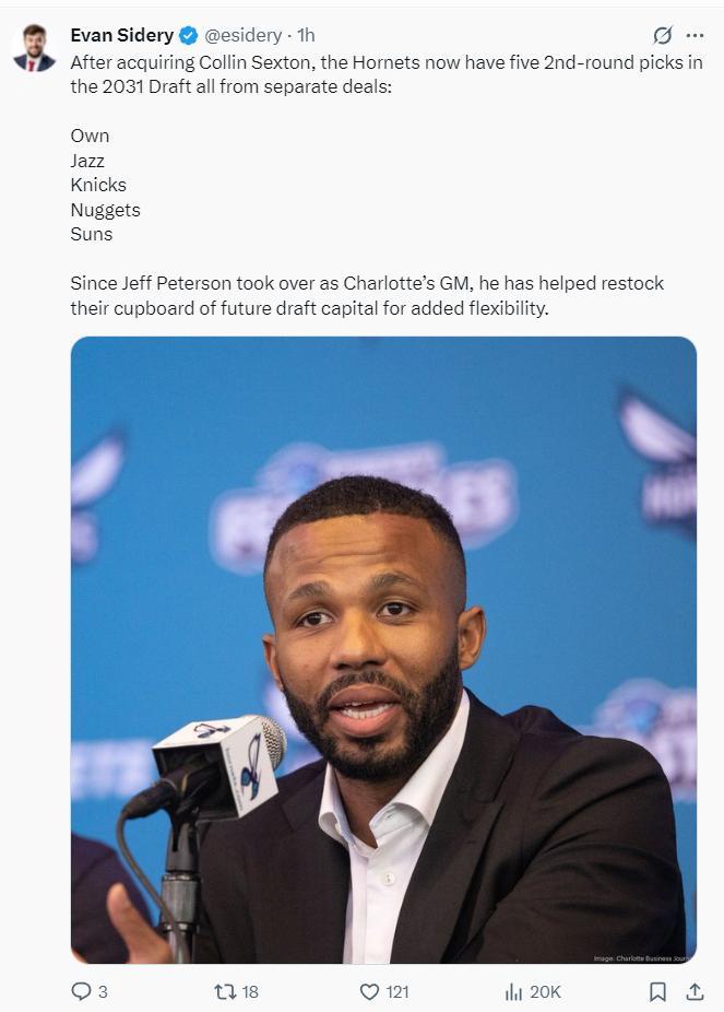 《福布斯體育》記者埃文-斯迪瑞寫道:傑夫-彼得森已經爲黃蜂隊囤積了多個2031年的次輪籤:黃蜂、爵士、尼克斯、掘金、太陽,自從彼得森接手黃蜂GM一職後他已經幫助球隊獲得多個未來選秀權。